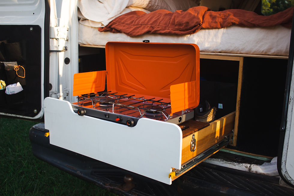 The van is equipped with everything you need besides a bathroom. A full sized custom mattress (technically 5" short) easily fits two. A pull out stovetop is perfect for cooking on the go, while our cooler style refrigerator keeps our food cold during the day. And lastly two Jackery Solar batteries (Explorer 1000 & 1500) keep the fridge running, lights on, and fans blowing.
